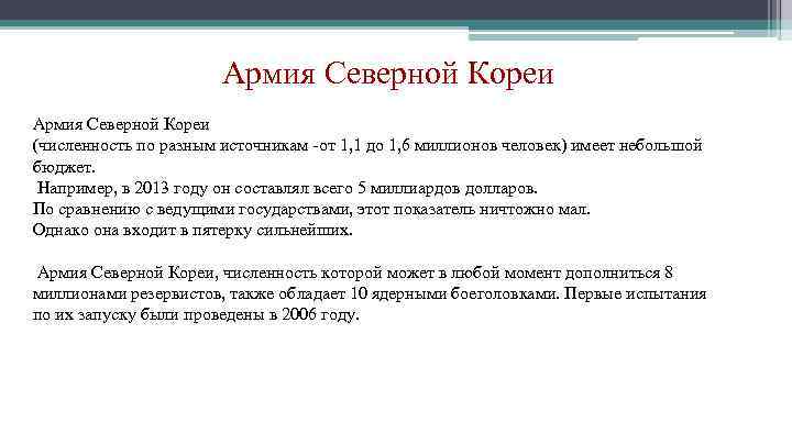 Армия Северной Кореи (численность по разным источникам -от 1, 1 до 1, 6 миллионов человек) имеет небольшой бюджет. Например, в 2013 году он составлял всего 5 миллиардов долларов. По сравнению с ведущими государствами, этот показатель ничтожно мал. Однако она входит в пятерку сильнейших. Армия Северной Кореи, численность которой может в любой момент дополниться 8 миллионами резервистов, также обладает 10 ядерными боеголовками. Первые испытания по их запуску были проведены в 2006 году.
