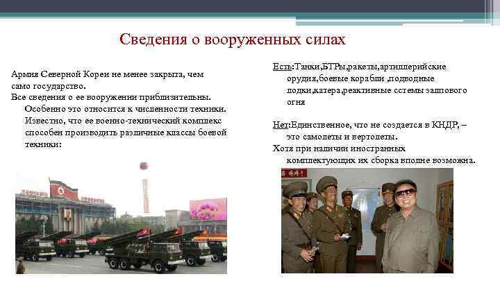 Сведения о вооруженных силах Армия Северной Кореи не менее закрыта, чем само государство. Все сведения о ее вооружении приблизительны. Особенно это относится к численности техники. Известно, что ее военно-технический комплекс способен производить различные классы боевой техники: Есть: Танки, БТРы, ракеты, артиллерийские орудия, боевые корабли , подводные лодки, катера, реактивные сстемы залпового огня Нет: Единственное, что не создается в КНДР, – это самолеты и вертолеты. Хотя при наличии иностранных комплектующих их сборка вполне возможна.