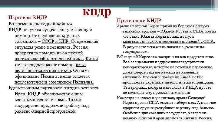 Партнеры КНДР кндр Во времена «холодной войны» КНДР получала существенную военную помощь от двух своих крупных союзников – СССР и КНР. Современная ситуация резко изменилась. Россия прекратила помощь из-за плохой платежеспособности республики. Китай же не предоставляет помощь из-за недовольства ее политикой. Однако официально Пекин все еще остается покровителем и союзником Пхеньяна. Единственным партнером сегодня остается Иран. КНДР обменивается с ним военными технологиями. Также государство продолжает работу над ракетно-ядерной программой. Противники КНДР Армия Северной Кореи призвана бороться с двумя главными врагами – Южной Кореей и США. Когда -то давно Южная Корея пошла по пути капиталистических и союзных отношений с США. В результате чего стала довольно успешным государством. В Северной Корее это восприняли как предательство. Вся ее идеология поддерживается упрямыми консерваторами, которые не готовы к переменам. Даже смерть главного вождя не изменила ситуацию. Его сын и преемник Ким Чен Ын продолжает укреплять идеологические принципы. Та верхушка, которая находится в КНДР, просто не позволит ему провести изменения Несмотря на массу недостатков, армия Северной Кореи против США сможет побороться. А наличие ядерного оружия усугубляет картину еще больше. Особенно для соседних государств, которыми помимо Южной Кореи являются Китай и Россия.