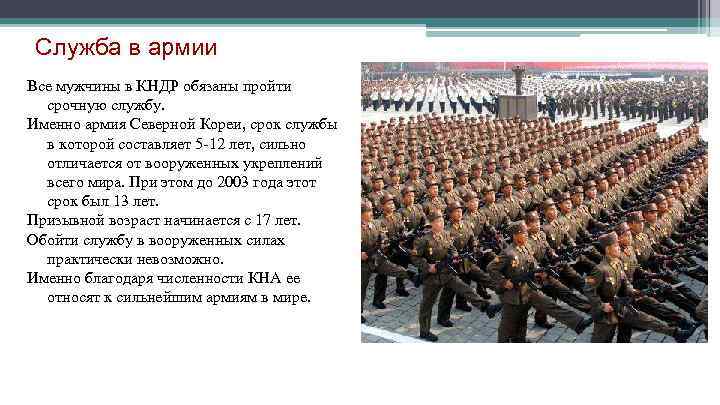 Служба в армии Все мужчины в КНДР обязаны пройти срочную службу. Именно армия Северной Кореи, срок службы в которой составляет 5 -12 лет, сильно отличается от вооруженных укреплений всего мира. При этом до 2003 года этот срок был 13 лет. Призывной возраст начинается с 17 лет. Обойти службу в вооруженных силах практически невозможно. Именно благодаря численности КНА ее относят к сильнейшим армиям в мире.