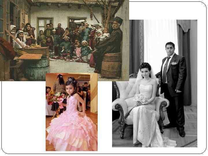 Армянские традиции Армяне имеют множество национальных праздников. Свадьба у армян— это очень большой праздник. Её церемониал включает сговор, обручение и само свадебное торжество. Гостей на армянской свадьбе много. В роли свидетелей на армянской свадьбе выступают «крестные свадьбы» . Как правило, это самая близкая, самая уважаемая семейная пара из окружения жениха и невесты. У армян принято иметь в семье более двух детей. Рождение ребёнка всегда сопровождается пиром и торжеством.