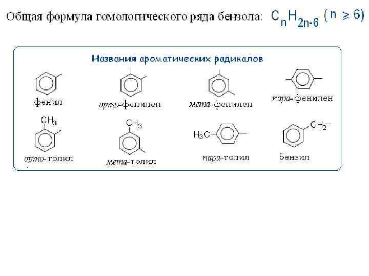 Классификация аренов Гомологи бензола (одноядерные арены):