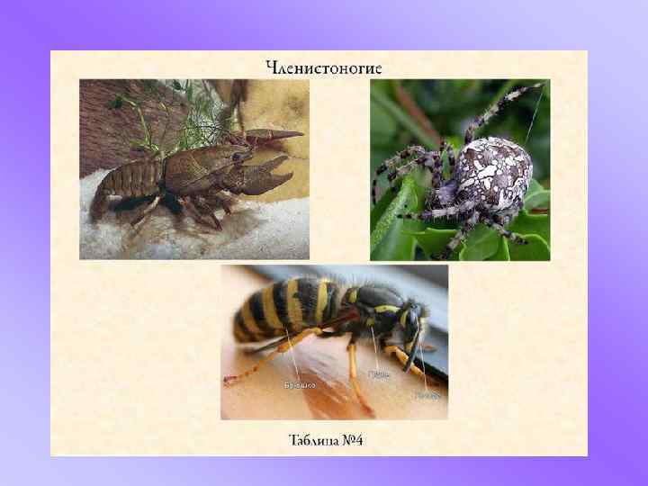 Тип членистоногие 1. Разделение тела на отделы( голова, головогрудь, брюшко) 2. Появление членистых конечностей 3. Появление поперечнополосатой мускулатуры 4. Наружный скелет (хитиновый) 5. Усложнение систем органов ( кровеносная система незамкнутая; лёгкие, трахеи, жабры; метанефридии, мальпигиевые сосуды)