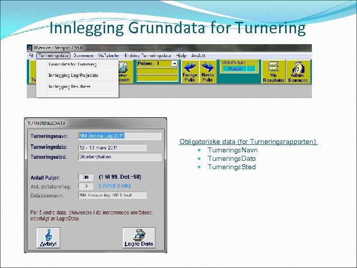 Innlegging Grunndata for Turnering Obligatoriske data (for Turneringsrapporten): Turnerings. Navn Turnerings. Dato Turnerings. Sted