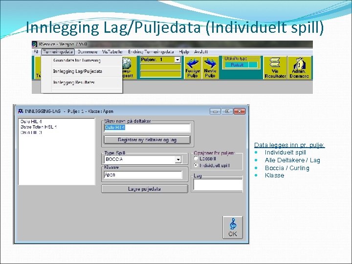 Innlegging Lag/Puljedata (Individuelt spill) Data legges inn pr. pulje: Individuelt spill Alle Deltakere / Lag Boccia / Curling Klasse