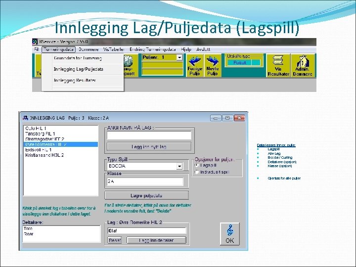 Innlegging Lag/Puljedata (Lagspill) Data legges inn pr. pulje: Lagspill Alle Lag Boccia / Curling Deltakere (opsjon) Klasse (opsjon) Gjentas for alle puljer