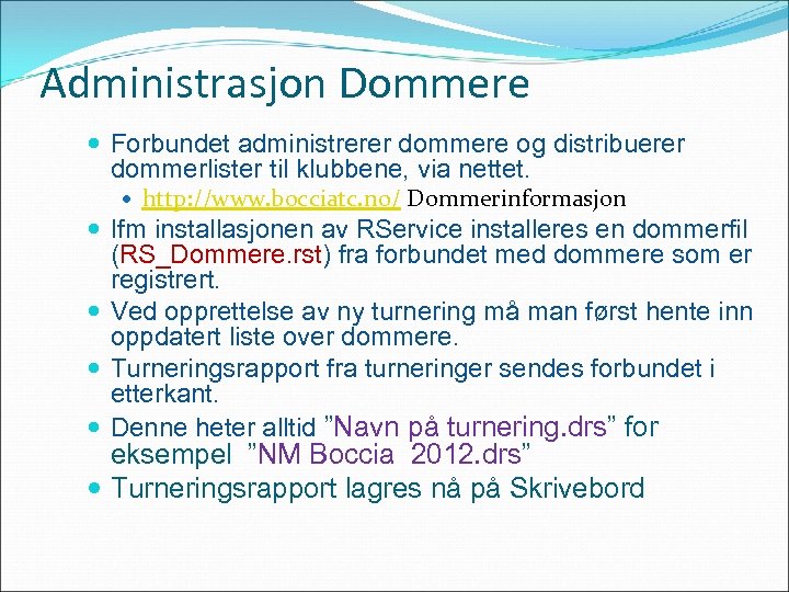 Administrasjon Dommere Forbundet administrerer dommere og distribuerer dommerlister til klubbene, via nettet. http: //www. bocciatc. no/ Dommerinformasjon Ifm installasjonen av RService installeres en dommerfil (RS_Dommere. rst) fra forbundet med dommere som er registrert. Ved opprettelse av ny turnering må man først hente inn oppdatert liste over dommere. Turneringsrapport fra turneringer sendes forbundet i etterkant. Denne heter alltid ”Navn på turnering. drs” for eksempel ”NM Boccia 2012. drs” Turneringsrapport lagres nå på Skrivebord
