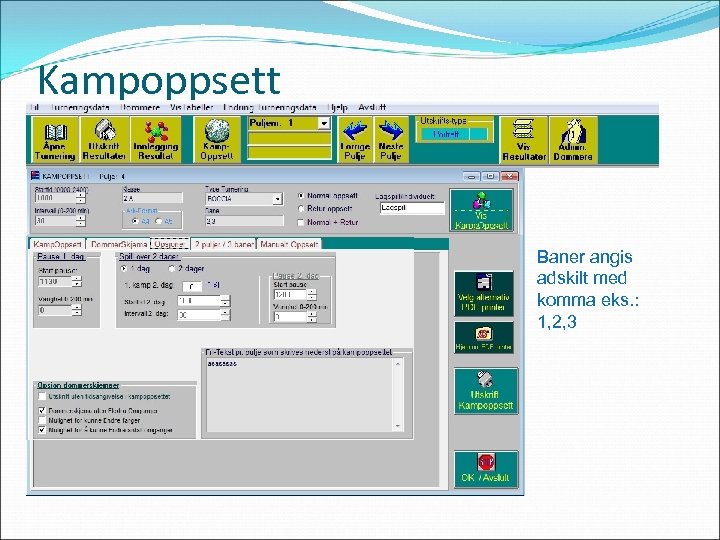 Kampoppsett Baner angis adskilt med komma eks. : 1, 2, 3