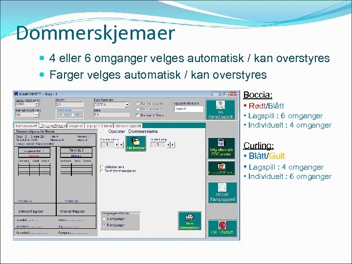 Dommerskjemaer 4 eller 6 omganger velges automatisk / kan overstyres Farger velges automatisk / kan overstyres Boccia: • Rødt/Blått • Lagspill : 6 omganger • Individuelt : 4 omganger Curling: • Blått/Gult • Lagspill : 4 omganger • Individuelt : 6 omganger