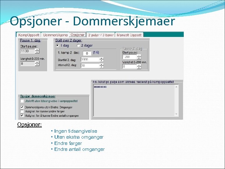 Opsjoner - Dommerskjemaer Opsjoner: • Ingen tidsangivelse • Uten ekstra omganger • Endre farger • Endre antall omganger