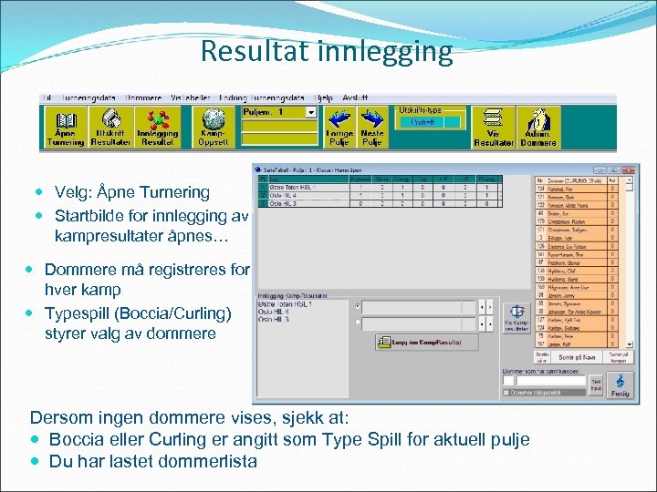 Resultat innlegging Velg: Åpne Turnering Startbilde for innlegging av kampresultater åpnes… Dommere må registreres for hver kamp Typespill (Boccia/Curling) styrer valg av dommere Dersom ingen dommere vises, sjekk at: Boccia eller Curling er angitt som Type Spill for aktuell pulje Du har lastet dommerlista