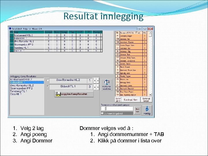 Resultat innlegging 1. Velg 2 lag 2. Angi poeng 3. Angi Dommer velges ved å : 1. Angi dommernummer + TAB 2. Klikk på dommer i lista over