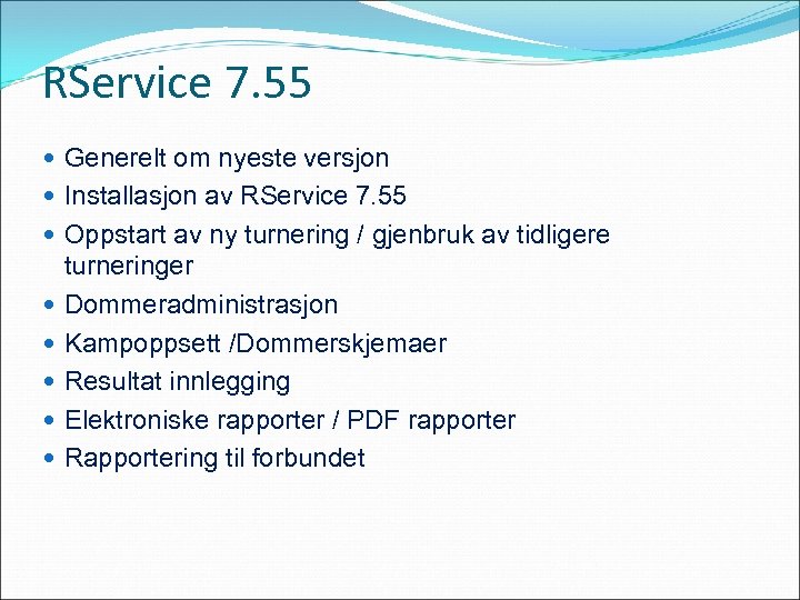 RService 7. 55 Generelt om nyeste versjon Installasjon av RService 7. 55 Oppstart av ny turnering / gjenbruk av tidligere turneringer Dommeradministrasjon Kampoppsett /Dommerskjemaer Resultat innlegging Elektroniske rapporter / PDF rapporter Rapportering til forbundet