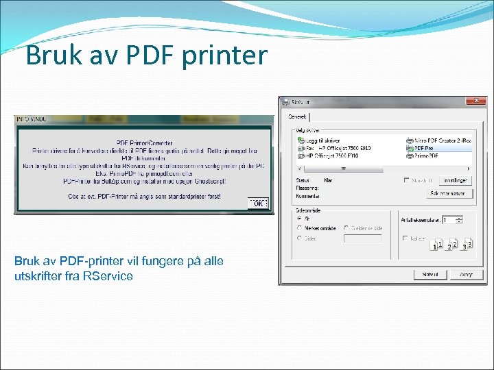 Bruk av PDF printer Bruk av PDF-printer vil fungere på alle utskrifter fra RService