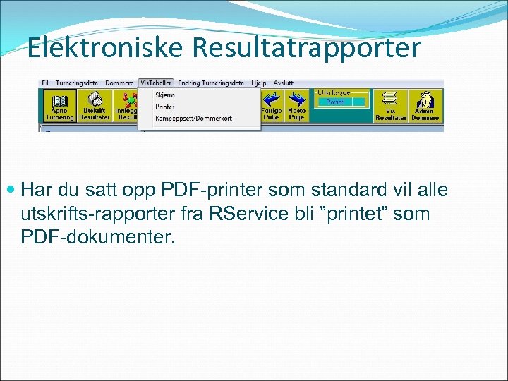 Elektroniske Resultatrapporter Har du satt opp PDF-printer som standard vil alle utskrifts-rapporter fra RService bli ”printet” som PDF-dokumenter.