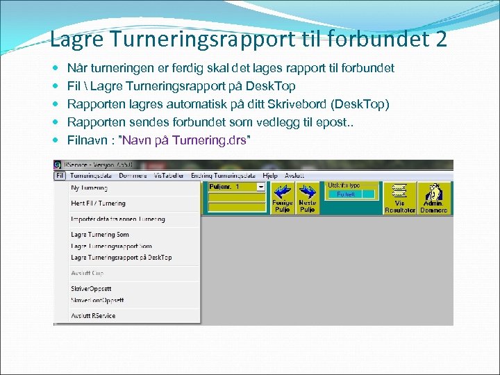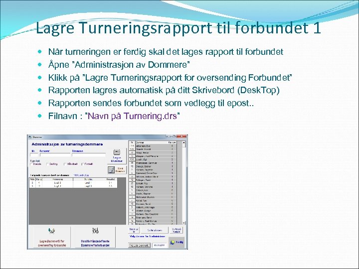 Lagre Turneringsrapport til forbundet 1 Når turneringen er ferdig skal det lages rapport til forbundet Åpne ”Administrasjon av Dommere” Klikk på ”Lagre Turneringsrapport for oversending Forbundet” Rapporten lagres automatisk på ditt Skrivebord (Desk. Top) Rapporten sendes forbundet som vedlegg til epost. . Filnavn : ”Navn på Turnering. drs”
