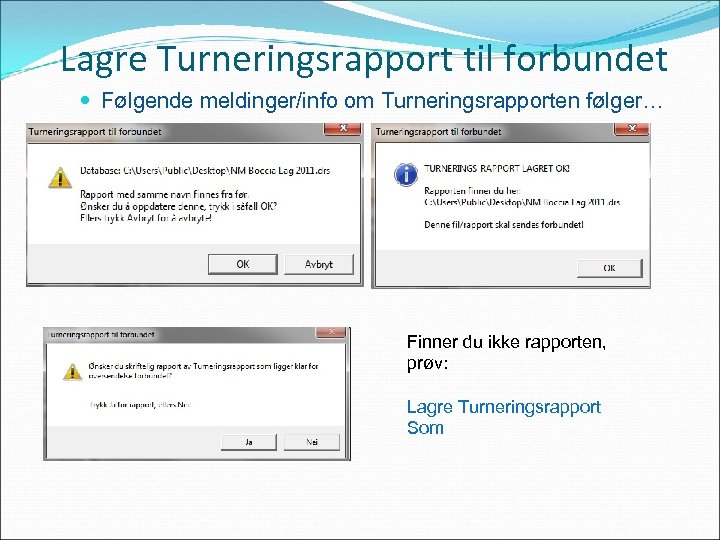Lagre Turneringsrapport til forbundet Følgende meldinger/info om Turneringsrapporten følger… Finner du ikke rapporten, prøv: Lagre Turneringsrapport Som