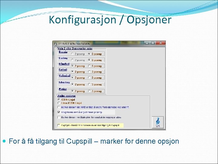 Konfigurasjon / Opsjoner For å få tilgang til Cupspill – marker for denne opsjon