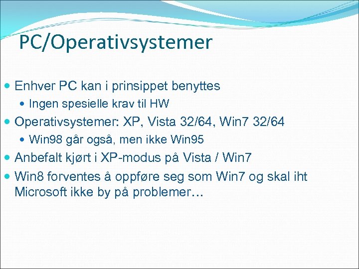 PC/Operativsystemer Enhver PC kan i prinsippet benyttes Ingen spesielle krav til HW Operativsystemer: XP, Vista 32/64, Win 7 32/64 Win 98 går også, men ikke Win 95 Anbefalt kjørt i XP-modus på Vista / Win 7 Win 8 forventes å oppføre seg som Win 7 og skal iht Microsoft ikke by på problemer…