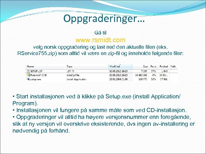 Oppgraderinger… Gå til www. rsmidt. com velg norsk oppgradering og last ned den aktuelle filen (eks. RService 755. zip) som alltid vil være en zip-fil og inneholde følgende filer: • Start installasjonen ved å klikke på Setup. exe (install Application/ Program). • Installasjonen vil fungere på samme måte som ved CD-installasjon. • Oppgraderinger vil alltid ha høyere versjonsnummer enn foregående, slik at ny versjon vil overskrive eksisterende, dvs ingen av-installering er nødvendig på forhånd.
