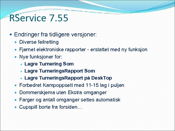 RService 7. 55 Endringer fra tidligere versjoner: Diverse feilretting Fjernet elektroniske rapporter - erstattet med ny funksjon Nye funksjoner for: Lagre Turnering Som Lagre Turnerings. Rapport på Desk. Top Forbedret Kampoppsett med 11 -15 lag i puljen Dommerskjema uten Ekstra omganger Farger og antall omganger settes automatisk Cupspill borte fra forsiden…
