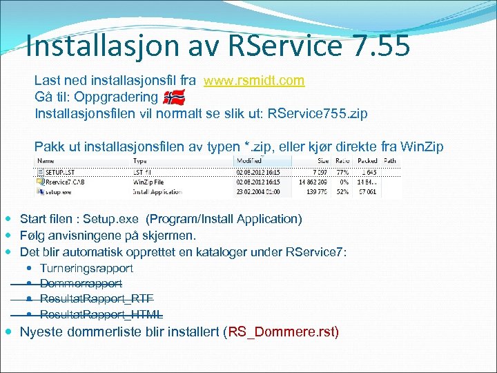 Installasjon av RService 7. 55 Last ned installasjonsfil fra www. rsmidt. com Gå til: Oppgradering Installasjonsfilen vil normalt se slik ut: RService 755. zip Pakk ut installasjonsfilen av typen *. zip, eller kjør direkte fra Win. Zip Start filen : Setup. exe (Program/Install Application) Følg anvisningene på skjermen. Det blir automatisk opprettet en kataloger under RService 7: Turneringsrapport Dommerrapport Resultat. Rapport_RTF Resultat. Rapport_HTML Nyeste dommerliste blir installert (RS_Dommere. rst)