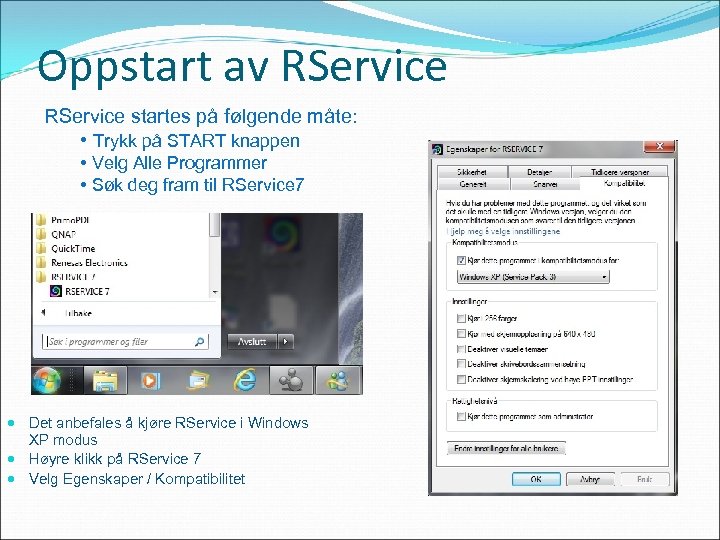 Oppstart av RService startes på følgende måte: • Trykk på START knappen • Velg Alle Programmer • Søk deg fram til RService 7 Det anbefales å kjøre RService i Windows XP modus Høyre klikk på RService 7 Velg Egenskaper / Kompatibilitet