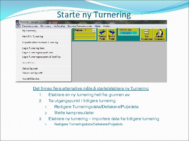 Starte ny Turnering Det finnes flere alternative måte å starte/etablere ny Turnering 1. Etablere en ny turnering helt fra grunnen av 2. Ta utgangspunkt i tidligere turnering 1. Redigere Turneringsdata/Deltakere/Puljedata 2. Slette kampresultater 3. Etablere ny turnering – importere data fra tidligere turnering 1. Redigere Turneringsdata/Deltakere/Puljedata