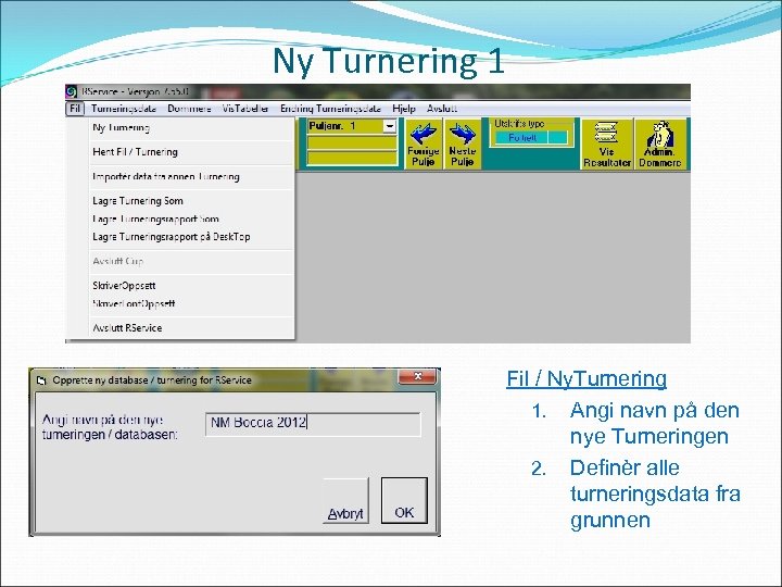 Ny Turnering 1 Fil / Ny. Turnering 1. Angi navn på den nye Turneringen 2. Definèr alle turneringsdata fra grunnen