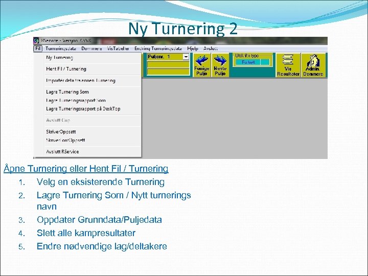 Ny Turnering 2 Åpne Turnering eller Hent Fil / Turnering 1. Velg en eksisterende Turnering 2. Lagre Turnering Som / Nytt turnerings navn 3. Oppdater Grunndata/Puljedata 4. Slett alle kampresultater 5. Endre nødvendige lag/deltakere