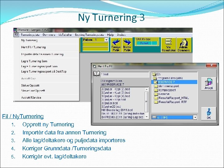 Ny Turnering 3 Fil / Ny. Turnering 1. Opprett ny Turnering 2. Importèr data fra annen Turnering 3. Alle lag/deltakere og puljedata importeres 4. Korriger Grunndata /Turneringsdata 5. Korrigèr evt. lag/deltakere