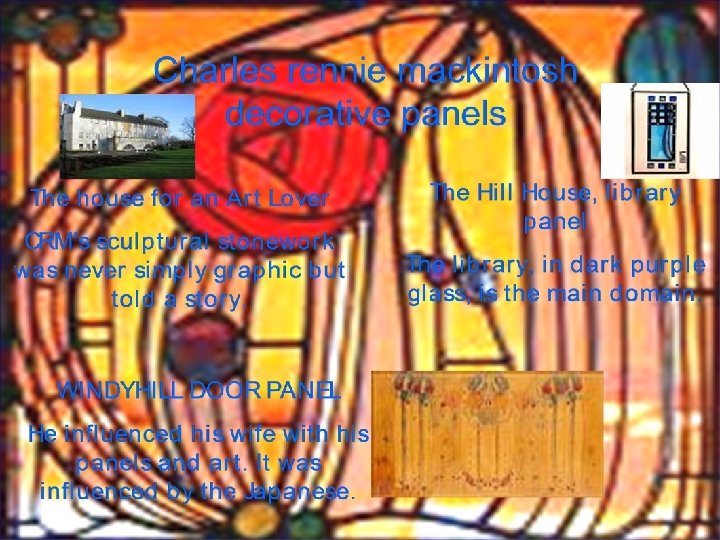 Why is he famous? Charles Rennie Mackintosh is famous for his successful building designs, paintings, stained glass windows, textiles, furniture, wallpaper and even cutlery! Charles died in 1928 aged 60. His work has become much more popular since his death. Stained glass Window Scotland St school Argyle Chair The white rose and the red rose