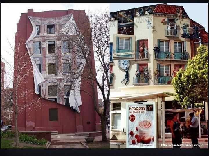 v ЛЕПНИНА -рельефные украшения(фигурные, орнаментальные) на фасадах и в интерьерах зданий, как правило, отлитые или отпрессованные из гипса, бетона, штукатурки, папье-маше или др. материалов. v АЭРОГРАФИЯ -технический прием , используемый для разбрызгивания краски или лака посредством сжатого воздуха. Аэрограф удобен для покрытия колером больших плоскостей, создания оттенков цвета или проведения сверхтонких линий. v ГРАФФИТИ- изобразительное искусство вдохновленное культурой hip-hop. Основной инструмент это аэрозольная краска, с помощью которой наносятся рисунки на постройках. v И не только. . .