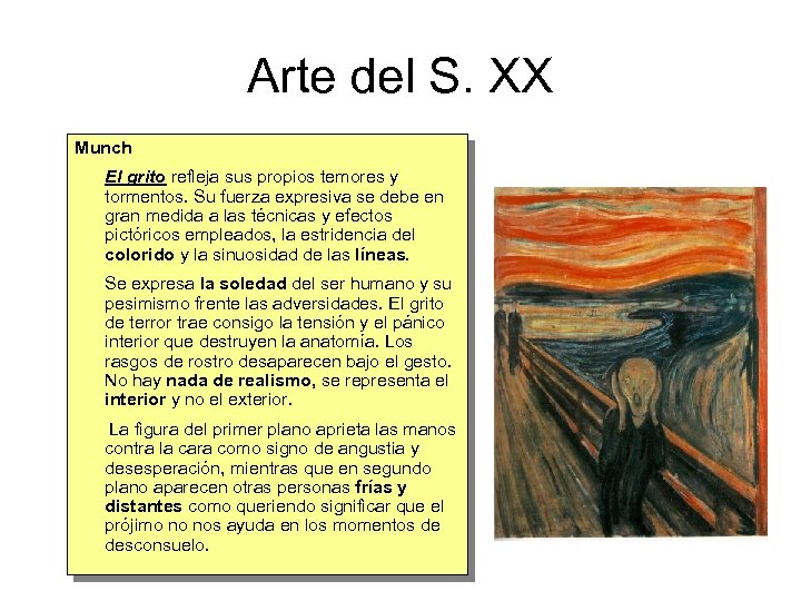Arte del S. XX Munch El grito refleja sus propios temores y tormentos. Su fuerza expresiva se debe en gran medida a las técnicas y efectos pictóricos empleados, la estridencia del colorido y la sinuosidad de las líneas. Se expresa la soledad del ser humano y su pesimismo frente las adversidades. El grito de terror trae consigo la tensión y el pánico interior que destruyen la anatomía. Los rasgos de rostro desaparecen bajo el gesto. No hay nada de realismo, se representa el interior y no el exterior. La figura del primer plano aprieta las manos contra la cara como signo de angustia y desesperación, mientras que en segundo plano aparecen otras personas frías y distantes como queriendo significar que el prójimo no nos ayuda en los momentos de desconsuelo.