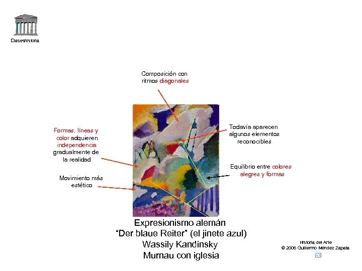 Claseshistoria Composición con ritmos diagonales Formas, líneas y color adquieren independencia gradualmente de la realidad Movimiento más estético Todavía aparecen algunos elementos reconocibles Equilibrio entre colores alegres y formas Expresionismo alemán “Der blaue Reiter” (el jinete azul) Wassily Kandinsky Murnau con iglesia Historia del Arte © 2006 Guillermo Méndez Zapata