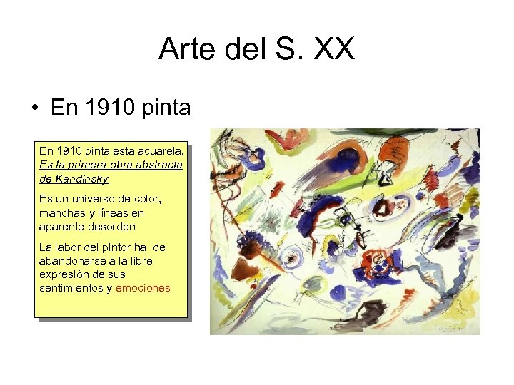 Arte del S. XX • En 1910 pinta esta acuarela. Es la primera obra abstracta de Kandinsky Es un universo de color, manchas y líneas en aparente desorden La labor del pintor ha de abandonarse a la libre expresión de sus sentimientos y emociones