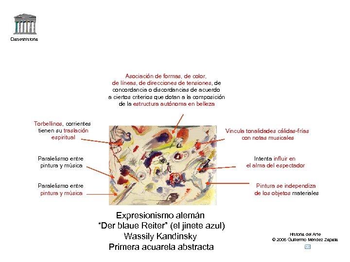 Claseshistoria Asociación de formas, de color, de líneas, de direcciones de tensiones, de concordancia o discordancias de acuerdo a ciertos criterios que dotan a la composición de la estructura autónoma en belleza Torbellinos, corrientes tienen su traslación espiritual Vincula tonalidades cálidas-frías con notas musicales Paralelismo entre pintura y música Intenta influir en el alma del espectador Paralelismo entre pintura y música Pintura se independiza de los objetos materiales Expresionismo alemán “Der blaue Reiter” (el jinete azul) Wassily Kandinsky Primera acuarela abstracta Historia del Arte © 2006 Guillermo Méndez Zapata