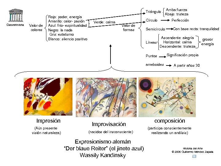 Triángulo Claseshistoria Valor de colores Rojo: poder, energía Amarillo: calor- pasión Azul: frío- espiritualidad Negro: la nada Gris: estatismo Blanco: silencio positivo Verde: calma Círculo Valor de formas Semicírculo ameboides (Aún presente visión naturaleza) Perfección Con base recta: tranquilidad Ascendente: alegría Horizontal: calma Líneas Descendente: tristeza Puntos Impresión Arriba: fuerza Abajo: tristeza Improvisación (nacidos del insconsciente) Expresionismo alemán “Der blaue Reiter” (el jinete azul) Wassily Kandinsky grosor energía Significación propia A partir años 30 composición (participa conscientemente realizando un análisis) Historia del Arte © 2006 Guillermo Méndez Zapata