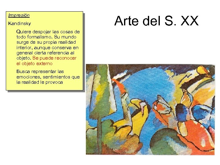 Impresión Kandinsky Quiere despojar las cosas de todo formalismo. Su mundo surge de su propia realidad interior, aunque conserva en general cierta referencia al objeto. Se puede reconocer el objeto externo Busca representar las emociones, sentimientos que la realidad le provoca Arte del S. XX