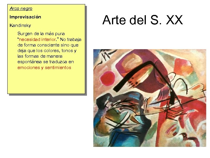Arco negro Improvisación Kandinsky Surgen de la más pura “necesidad interior. ” No trabaja de forma consciente sino que deja que los colores, tonos y las formas de manera espontánea se traduzca en emociones y sentimientos Arte del S. XX