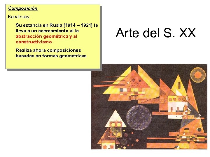 Composición Kandinsky Su estancia en Rusia (1914 – 1921) le lleva a un acercamiento al la abstracción geométrica y al constructivismo Realiza ahora composiciones basadas en formas geométricas Arte del S. XX