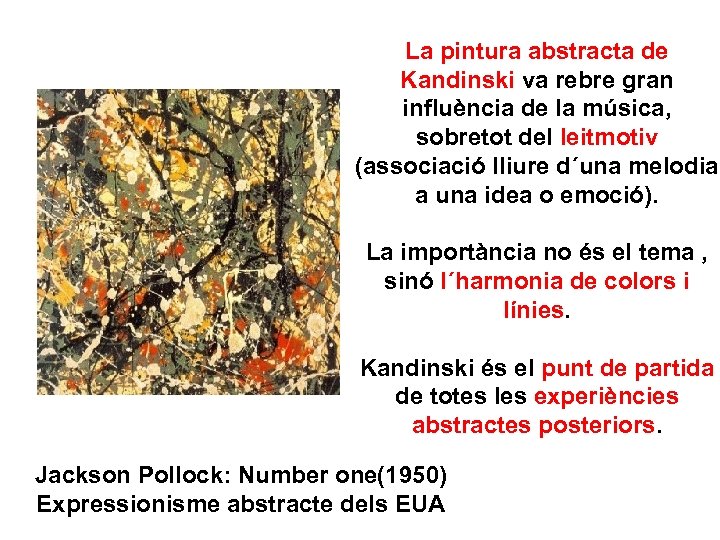 La pintura abstracta de Kandinski va rebre gran influència de la música, sobretot del leitmotiv (associació lliure d´una melodia a una idea o emoció). La importància no és el tema , sinó l´harmonia de colors i línies. Kandinski és el punt de partida de totes les experiències abstractes posteriors. Jackson Pollock: Number one(1950) Expressionisme abstracte dels EUA