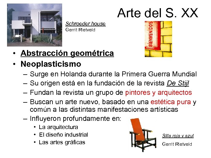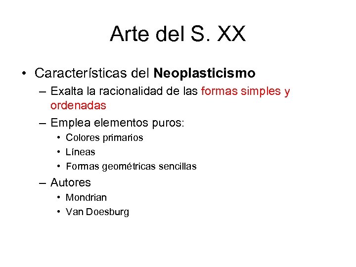 Arte del S. XX • Características del Neoplasticismo – Exalta la racionalidad de las formas simples y ordenadas – Emplea elementos puros: • Colores primarios • Líneas • Formas geométricas sencillas – Autores • Mondrian • Van Doesburg