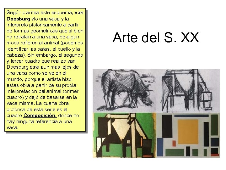 Según plantea este esquema, van Doesburg vio una vaca y la interpretó pictóricamente a partir de formas geométricas que si bien no retratan a una vaca, de algún modo refieren al animal (podemos identificar las patas, el cuello y la cabeza). Sin embargo, el segundo y tercer cuadro que realizó van Doesburg está aún más lejos de una vaca como se ve en el mundo, porque el artista hizo estas obra a partir de su propia interpretación del animal (primer cuadro) y dejó de basarse en la vaca misma. La cuarta obra pictórica de esta serie es el cuadro Composición, donde no hay ninguna referencia a una vaca. Arte del S. XX