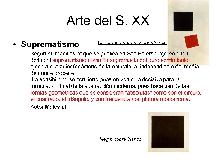 Arte del S. XX • Suprematismo Cuadrado negro y cuadrado rojo – Según el "Manifiesto" que se publica en San Petersburgo en 1913, define al suprematismo como "la supremacía del puro sentimiento" ajena a cualquier fenómeno de la naturaleza, independiente del medio de donde procede. La sensibilidad se convierte pues en vehículo decisivo para la formulación final de la abstracción moderna, pues hace uso de las formas geométricas que se consideran "absolutas" como son el círculo, el cuadrado, el triángulo, y con frecuencia con pintura monocroma. – Autor Malevich Negro sobre blanco