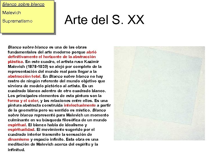 Blanco sobre blanco Malevich Suprematismo Arte del S. XX Blanco sobre blanco es una de las obras fundamentales del arte moderno porque abrió definitivamente el horizonte de la abstracción plástica. En este cuadro, el artista ruso Kazimir Malevich (1878 -1935) se alejó por completo de la representación del mundo real para llegar a la abstracción total. En Blanco sobre blanco no hay rastro de ningún referente del mundo objetivo que sirviera de modelo pictórico al artista. Es un cuadrado blanco adentro de otro cuadrado blanco. Los principales elementos de esta pintura son la forma y el color, y las relaciones entre ellos. Es una pintura abstracta construida intelectualmente a partir de la geometría pero su sentido es místico. Blanco sobre blanco representó para Malevich un momento culminante en su búsqueda filosófica de un mundo espiritual. El blanco habla de idealismo y espiritualidad. El movimiento sugerido por el cuadrado interior transmite la sensación de dinamismo y espacio infinito. Esta obra es una meditación de Malevich acerca del espíritu y la infinitud.
