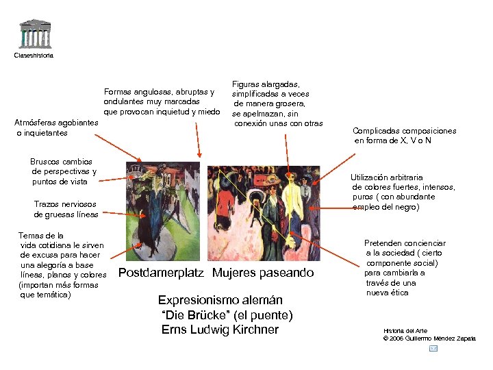 Claseshistoria Formas angulosas, abruptas y ondulantes muy marcadas que provocan inquietud y miedo Atmósferas agobiantes o inquietantes Figuras alargadas, simplificadas a veces de manera grosera, se apelmazan, sin conexión unas con otras Bruscos cambios de perspectivas y puntos de vista Utilización arbitraria de colores fuertes, intensos, puros ( con abundante empleo del negro) Trazos nerviosos de gruesas líneas Temas de la vida cotidiana le sirven de excusa para hacer una alegoría a base líneas, planos y colores (importan más formas que temática) Complicadas composiciones en forma de X, V o N Postdamerplatz Mujeres paseando Expresionismo alemán “Die Brücke” (el puente) Erns Ludwig Kirchner Pretenden concienciar a la sociedad ( cierto componente social) para cambiarla a través de una nueva ética Historia del Arte © 2006 Guillermo Méndez Zapata