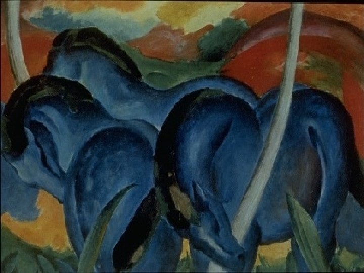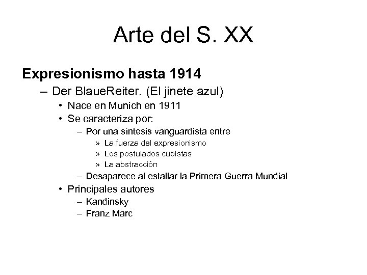 Arte del S. XX Expresionismo hasta 1914 – Der Blaue. Reiter. (El jinete azul) • Nace en Munich en 1911 • Se caracteriza por: – Por una síntesis vanguardista entre » La fuerza del expresionismo » Los postulados cubistas » La abstracción – Desaparece al estallar la Primera Guerra Mundial • Principales autores – Kandinsky – Franz Marc