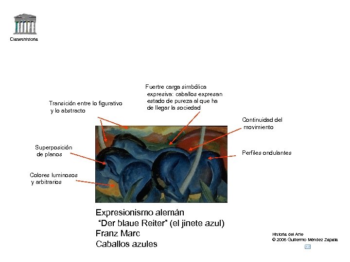 Claseshistoria Transición entre lo figurativo y lo abstracto Fuertre carga simbólica expresiva: caballos expresan estado de pureza al que ha de llegar la sociedad Continuidad del movimiento Superposición de planos Perfiles ondulantes Colores luminosos y arbitrarios Expresionismo alemán “Der blaue Reiter” (el jinete azul) Franz Marc Caballos azules Historia del Arte © 2006 Guillermo Méndez Zapata