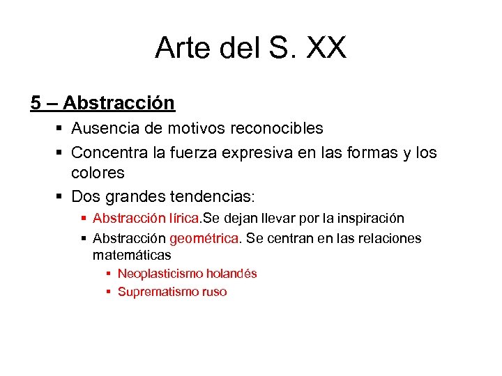 Arte del S. XX 5 – Abstracción § Ausencia de motivos reconocibles § Concentra la fuerza expresiva en las formas y los colores § Dos grandes tendencias: § Abstracción lírica. Se dejan llevar por la inspiración § Abstracción geométrica. Se centran en las relaciones matemáticas § Neoplasticismo holandés § Suprematismo ruso